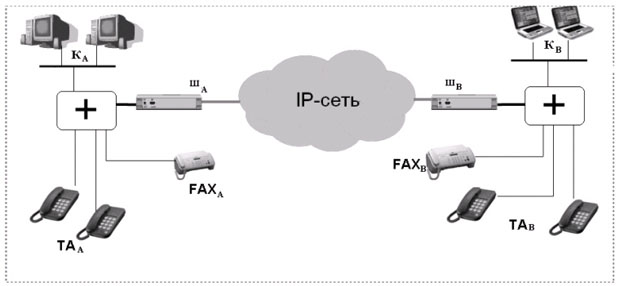 Рис. 5.1. Компьютерная сеть с наложенной на нее IP-телефонией · А, В - абоненты, обменивающиеся информацией по сети. · KА, КВ - компьютеры абонентов А и В соответственно. · ША и ШВ - шлюзы А и В. · FAXА и FAXВ - телефаксы А и В. · ТAА и ТAВ - телефоны А и В. Открытая архитектура - еще одна важная особенность VoIP. Еще одним положительным свойством IP-телефонии является наличие общих протоколов IP-телефонии: H.323, MGCP, SIP и т. д.