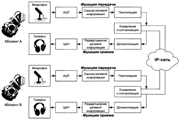 Можно выделить три наиболее часто используемых сценария IP-телефонии: · компьютер-компьютер; · телефон-компьютер; · телефон-телефон. Первые сценарий " компьютер-компьютер" реализуется на базе стандартных компьютеров, оснащенных средствами мультимедиа и подключенных к сети Интернет. Компоненты сценария " компьютер-компьютер " показаны на рис. 5.7. В этом сценарии аналоговые речевые сигналы от микрофона абонента А преобразуются в цифровую форму с помощью аналого-цифрового преобразователя (АЦП).