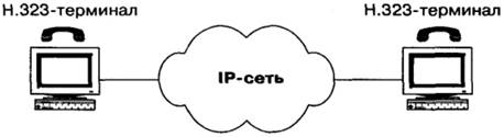 Рис. 5.7. Сценарий IP-телефонии " компьютер-компьютер" Для поддержки сценария " компьютер-компьютер " поставщику услуг Интернет необходимо иметь отдельный сервер (GateKeeper), преобразующий имена пользователей в динамические адреса IP. Рассмотрим представленный на рис. 5.7 сценарий установления соединения " компьютер-компьютер" более подробно. Для проведения телефонных разговоров друг с другом абоненты А и Б должны иметь доступ к Интернету или к другой сети с протоколом IP. Разберем возможный алгоритм организации связи между этими абонентами на примере протокола H.323. 1. Абонент А запускает свое приложение IP-телефонии, поддерживающее протокол Н.323. 2. Абонент Б также заранее запустил свое приложение IP-телефонии, поддерживающее протокол Н.323. 3. Абонент А знает доменное имя абонента Б - Domain Name System (DNS), вводит это имя в раздел " кому позвонить" в своем приложении IP-телефонии и нажимает кнопку Return. 4. Приложение IP-телефонии обращается к DNS-серверу (который в данном примере реализован непосредственно в персональном компьютере абонента А) для того, чтобы преобразовать доменное имя абонента Б в IP-адрес. 5. Сервер DNS возвращает IP-адрес абонента Б. 6. Приложение IP-телефонии абонента А получает IP-адрес абонента Б и отправляет по этому адресу сигнальное сообщение Н.225 Setup. 7. При получении сообщения Н.225 Setup приложение Б сигнализирует абоненту Б о входящем вызове. 8. Абонент Б принимает вызов и приложение IP-телефонии отправляет ответное сообщение Н.225 Connect. 9. Приложение IP-телефонии у абонента А начинает взаимодействие с приложением у абонента Б в соответствии с рекомендацией Н.245. 10. После окончания взаимодействия по протоколу Н.245 и открытия логических каналов абоненты А и Б могут разговаривать друг с другом через IP-сеть. Упрощенное изображение аналога рис. 5.7 является представление того же сценария на рис. 5.8.