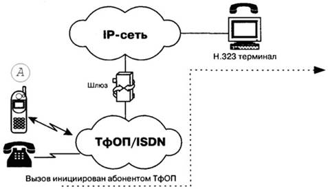 Рис. 5.8. Упрощенный сценарий IP-телефонии " компьютер-компьютер" Следующий сценарий " телефон-компьютер " находит применение в разного рода справочно-информационных службах Интернета, в службах сбыта товаров или в службах технической поддержки. Пользователь, подключившийся к cepвepy WWW какой-либо компании, имеет возможность обратиться к оператору справочной службы. Это вполне соответствует стилю жизни современных потребителей, связанному с потребностью в дополнительных удобствах и экономии времени. Во втором сценарии " телефон-компьютер " соединение устанавливается между пользователем ТфОП и пользователем IP-сети (рис. 5.9). Предполагается, что установление соединения инициирует пользователь сети коммутации каналов.