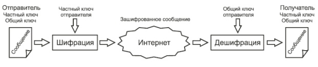 Рис. 7.1. Симметричное шифрование Сегодня широко используются такие алгоритмы секретных ключей, как Data Encryption Standard (DES), 3DES (или " тройной DES") и International Data Encryption Algorithm (IDEA). Эти алгоритмы шифруют сообщения блоками по 64 бита. Если объем сообщения превышает 64 бита (как это обычно и бывает), необходимо разбить его на блоки по 64 бита в каждом, а затем каким-то образом свести их воедино. Такое объединение, как правило, осуществляется одним из четырех методов: · электронной кодовой книги (Electronic Code Book - ECB); · цепочки зашифрованных блоков (Cipher Block Changing - CBC); · x-битовой зашифрованной обратной связи (Cipher FeedBack - CFB-x); · выходной обратной связи (Output FeedBack - OFB). Шифрование с помощью секретного ключа чаще всего используется для поддержки конфиденциальности данных и очень эффективно реализуется с помощью неизменяемых " вшитых" программ (firmware). Этот метод можно использовать для аутентификации и поддержания целостности данных, но метод цифровой подписи является более эффективным. С методом секретных ключей связаны следующие проблемы: · Необходимо часто менять секретные ключи, поскольку всегда существует риск их случайного раскрытия. · Трудно обеспечить безопасную генерацию и распространение секретных ключей. Асимметричное шифрование часто называют шифрованием с помощью общего ключа, при котором используются разные, но взаимно дополняющие друг друга ключи и алгоритмы шифрования и расшифровки. Для того чтобы установить связь с использованием шифрования через общий ключ, обеим сторонам нужно получить два ключа: общий и частный (рис. 3.2). Для шифрования и расшифровки данных стороны будут пользоваться разными ключами.