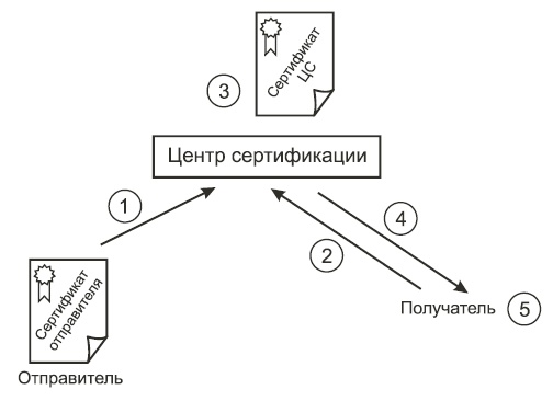 Рис. 7.4. Проверка подлинности сообщения с цифровой подписью Она может использоваться для аутентификации отправителя и целостности документа. Цифровые подписи можно создавать с помощью сочетания хэш-функций и криптографии общих ключей. Цифровым сертификатом называется сообщение с цифровой подписью, которое в настоящее время обычно используется для подтверждения действительности общего ключа. Общий формат широко распространенного сертификата X.509 включает следующие элементы: · версии; · серийный номер сертификата; · эмитент информации об алгоритме; · эмитент сертификата; · даты начала и окончания действия сертификата; · информацию об алгоритме общего ключа субъекта сертификата; · подпись эмитирующей организации. Эмитирующая организация, выдающая сертификат, или центр сертификации (Certification Authority - CA), является надежной третьей стороной, которой вы полностью доверяете. Передача общего ключа происходит следующим образом (рис. 7.5): 1. отправитель создает сертификат, в который включает общий ключ; 2. получатель запрашивает у центра сертификации сертификат отправителя; 3. центр сертификации подписывает сертификат отправителя; 4. центр сертификации посылает подписанный сертификат получателю; 5. получатель проверяет подпись центра сертификации и извлекает общий ключ отправителя.