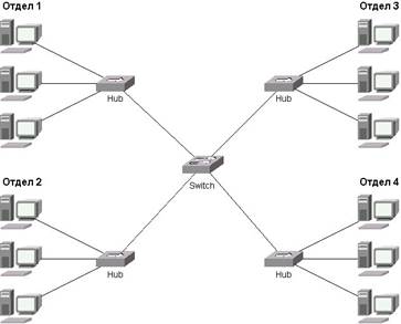 Рис.9. 24-х портовый коммутатор для технологии Fast Ethernet. Коммутаторы обеспечивают логическую структуризацию сети, которая предполагает разбиение сети на сегменты с локализованным трафиком. В случае, когда к портам коммутатора подключены только компьютеры, в одном сегменте сети находятся только компьютеры (отправитель или получатель пакетов данных). Если же к коммутатору подключены не компьютеры, а концентраторы (рис.10), то в одном локализованном сегменте сети находятся две рабочие группы (например Отдел 3 и Отдел 4 при передаче данных между компьютерами из этих отделов). Если же, к примеру, компьютеры Отдела 1 передают информацию внутри отдела, то остальные сегменты сети в этот момент времени будут свободны.