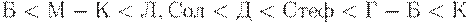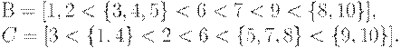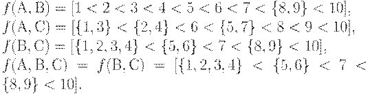 Конкретные кластеризованные ранжировки будем заключать в квадратные скобки. Если для простоты речи термин " кластер " применять только к кластеру не менее чем из 2-х элементов, то можно сказать, что в кластеризованную ранжировку Кластеризованная ранжировка, введенная описанным образом, является бинарным отношением на носителе - множестве Рассматриваемый математический объект известен в литературе как " ранжировка со связями" (М. Холлендер, Д. Вулф), " упорядочение" (Дж. Кемени, Дж. Снелл), " квазисерия" (Б.Г. Миркин), " совершенный квазипорядок" (Ю.А. Шрейдер. Учитывая разнобой в терминологии, было признано полезным ввести собственный термин " кластеризованная ранжировка", поскольку в нем явным образом названы основные элементы изучаемого математического объекта - кластеры, рассматриваемые на этапе согласования ранжировок как классы эквивалентности, и ранжировка - строгий совершенный порядок между ними. Следующее важное понятие - противоречивость. Оно определяется для четверки - две кластеризованные ранжировки на одном и том же носителе и два различных объекта - элементы того же носителя. При этом два элемента из одного кластера будем связывать символом равенства =, как эквивалентные. Пусть А и В - две кластеризованные ранжировки. Пару объектов В качестве примера рассмотрим, кроме