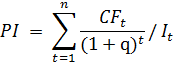 2. Индекс прибыльности инвестиций или индекс рентабельности (PI) показывает отношение отдачи капитала к размеру вложенного капитала. Показатель PI показывает относительную прибыльность проекта или дисконтируемую стоимость денежных поступлений от проекта в расчете на единицу вложений. Индекс прибыльности рассчитывается по формуле: