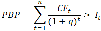 4. Срок окупаемости проекта (PBP). Под сроком окупаемости с дисконтированием понимают продолжительность периода, в течение которого сумма чистых доходов, дисконтированных на момент завершения инвестиций, равна сумме наращенных инвестиций. Дисконтированный срок окупаемости не что иное, как «точка безубыточности инвестиционного проекта». Если инвестиционный проект генерирует положительные денежные потоки после этой «точки окупаемости», чистый дисконтированный доход проекта положителен. Дисконтированный период окупаемости можно использовать для принятия или отклонения решений по независимым инвестициям, так как любой инвестиционный проект с жизненным циклом не меньше дисконтированного периода окупаемости, по крайней мере, обеспечивает окупаемость инвестиций. Дисконтированный период окупаемости является дополнительным показателем к тем, которые были рассмотрены выше. По этому показателю инвестор видит, за какой срок он может получить назад капитал, включая проценты. Последнее время высказывается мнение о том, что период окупаемости с дисконтированием должен не служить критерием выбора, а использоваться лишь в виде ограничения при принятии решения. Если срок окупаемости проектов больше, чем принятое ограничение, то они исключаются из списка возможных инвестиционных проектов. Ситуации, при которых применение периода окупаемости целесообразно когда: · инвестору важнее ликвидность, а не прибыльность проекта (главное, чтобы инвестиции окупились, и как можно скорее); · инвестиции сопряжены с высокой степенью рискованности, а чем короче срок окупаемости, тем менее рискованным является проект (например, в производствах с быстрыми технологическими изменениями). Срок окупаемости отражает скорее ликвидность, чем возрастание «ценности фирмы». Использование этого показателя обеспечивает отбор менее рискованных проектов, но не отражает всех видов рисков. При разных значениях нормы дисконта срок окупаемости будет различным. Если при определении срока окупаемости ставку дисконтирования принимают равной нулю, то говорят о сроке окупаемости без дисконта. Расчет величины PBP осуществляется согласно данным, приведенным в таблице 2.2. Алгоритм расчета срока окупаемости инвестиций зависит от равномерности распределения прогнозируемых доходов от инвестиций. · Если доход распределен по годам равномерно, то срок окупаемости рассчитывают делением единовременных затрат на величину годового дохода, ими обусловленного. При получении дробного числа – его округляют в сторону увеличения до ближайшего целого. · Если прибыль распределена неравномерно, то срок окупаемости находят прямым подсчетом числа лет, в течение которых инвестиция будет погашена кумулятивным (накопительным) подходом. Общая формула расчета показателя РВР имеет вид: Период окупаемости определяется как ожидаемое число лет, необходимое для полного возмещения инвестиционных затрат. Период окупаемости, РВР рассчитывается следующим образом:
