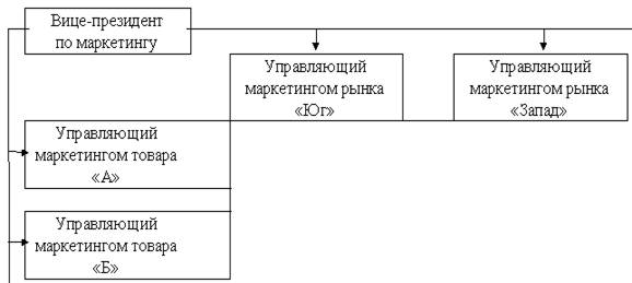 Рис. 2.6 Схема организации службы маркетинга по рыночному принципу. Ограниченность товарной и рыночной организации служб маркетинга преодолевается внедрением товарно-рыночной или матричной схемы (рис. 2.7).