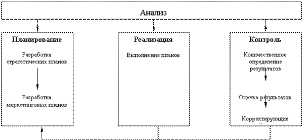 Стратегическое планирование маркетинга Стратегическое маркетинговое планирование состоит из трех стадий: · стратегического плана; · управления маркетингом; · реализации плана. Многие компании ведут свою деятельность безо всяких планов. Этому есть следующие объяснения: · менеджеры противятся составлению письменного плана, поскольку это требует значительного времени; · выдвигается аргумент, что рынок меняется слишком быстро, поэтому от планов нет никакой пользы. Все же формальное планирование имеет ряд преимуществ. Оно побуждает руководство постоянно думать о будущем. Оно заставляет компанию четче определять свои цели и политику, приводит к лучшей согласованности в работе и дает объективные показатели эффективности работы. Тщательное планирование помогает компании предвидеть изменения среды и оперативно реагировать на них, а также всегда быть готовой к непредвиденным обстоятельствам. Преуспевающие компании обычно составляют годовые, долгосрочные и стратегические планы. Годовой план представляет собой краткосрочный план, описывающий текущую ситуацию, цели компании, стратегию на предстоящий год, программу действий, бюджет и формы контроля. Долгосрочный план описывает основные факторы и силы, которые будут влиять на организацию на протяжении последующих нескольких лет. Он содержит долгосрочные цели, основные маркетинговые стратегии, которые будут использованы для их достижения, и определяет необходимые ресурсы. Такой долгосрочный план должен ежегодно обновляться с целью внесения корректив в соответствии с произошедшими изменениями. Стратегический план создается для того, чтобы помочь компании использовать в своих интересах возможности в постоянно изменяющейся среде. Это процесс установления и сохранения стратегического соответствия между целями и возможностями компании, с одной стороны, и изменяющимися возможностями рынка – с другой. Стратегическое планирование является фундаментом для остальных видов планирования в компании. Оно начинается с определения глобальных целей и миссии компании. Затем устанавливаются более конкретные цели. Для этого собирается полная информация о внутренней среде организации, ее конкурентах, ситуации на рынке и обо всем остальном, что может влиять на работу компании. Этот процесс носит названия SWOT-анализа. После проведения SWOT-анализа готовиться подробный отчет о сильных и слабых сторонах компании, возможностях и угрозах, с которыми ей придется столкнуться. Затем высшее руководство решает, какими конкретно видами деятельности следует заниматься, какую поддержку необходимо предоставить каждому из них. В свою очередь, каждое подразделение, отвечающее за отдельный товар или вид деятельности, должно разработать свои подробные маркетинговые планы. Таким образом, маркетинговое планирование, осуществляемое на уровнях подразделений, облегчает стратегическое планирование. Процесс планирования охватывает четыре этапа: анализ, планирование, реализация и контроль. Взаимосвязь между этими четырьмя этапами показана на рисунке 1.2.