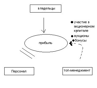 Разделение в компаниях на 3 группы участников по их отношению к прибыли: 1. Владельцы бизнеса. 2. Топ-менеджмент. Менеджменский пакет. Аукционный подход (например, акция стоит $10, а менеджмеру продают за $8). Бонусы (участие в прибыли, премиальная доля от прибыли). 3. Персонал. Влияние профсоюзов, требования поднять зарплату.
