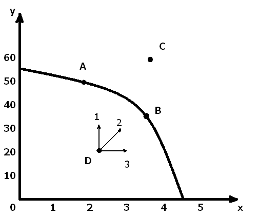 Количество другого продукта, от которого приходится отказаться для того, чтобы увеличить производство данного продукта, называется альтернативными издержками производства (вменёнными издержками производства). Все точки на кривой показывают полный объём производства при эффективном использовании ресурсов. Переход от одной точки к другой на кривой связан с изменением альтернативных (или вменённых) издержек. В экономике действует закон возрастания вменённых издержек, связанных со специализированностью экономических ресурсов. Любая точка внутри графика (для примера – D) – производство в условиях неполной занятости. Выход на эффективную работу возможен здесь в трёх направлениях. С – точка недостижимого объёма производства. Для её достижения в будущем необходимо 2 условия: 1) количественное увеличение экономических ресурсов; 2) совершенствование технологий, достижение нового качества экономического роста. Ответы на фундаментальные вопросы находятся в экономической системе. Что производить? То, в чём существует потребность, для чего имеются ресурсы, вменённые издержки производства чего минимальны. Как производить? Эффективно, рационально, с учётом возможностей кооперации. Для кого производить? Для тех, кто располагает доходами и способен сформировать платёжеспособный спрос.