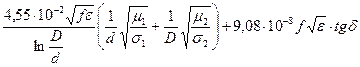 где f частота в Гц; d1=d – диаметр центрального проводника, d2=D – диаметр внешнего проводника, заданные в мм; Если оба проводника медные (