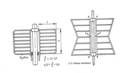 Каждый этаж такой антенны выполняется из двух взаимно перпендикулярных вибраторов, питаемых со сдвигом фаз p/2, что обеспечивает практически круговую диаграмму направленности в горизонтальной плоскости. Главным недостатком турникетных антенн является требование малого диаметра опоры по сравнению с размерами плеч – В верхней части метрового телевизионного диапазона (с VI по XII каналы, частоты с 174 по 230 МГц) используются панельные излучатели одиночные или сдвоенные (рис.4.3). Они располагаются по сторонам опоры квадратного сечения или в виде правильного многоугольника. Для получения круговой в горизонтальной плоскости диаграммы направленности вибраторы питаются синфазно. Используя достаточное число этажей можно получить усиление до 20¸ 50 по сравнению с полуволновым вибратором.