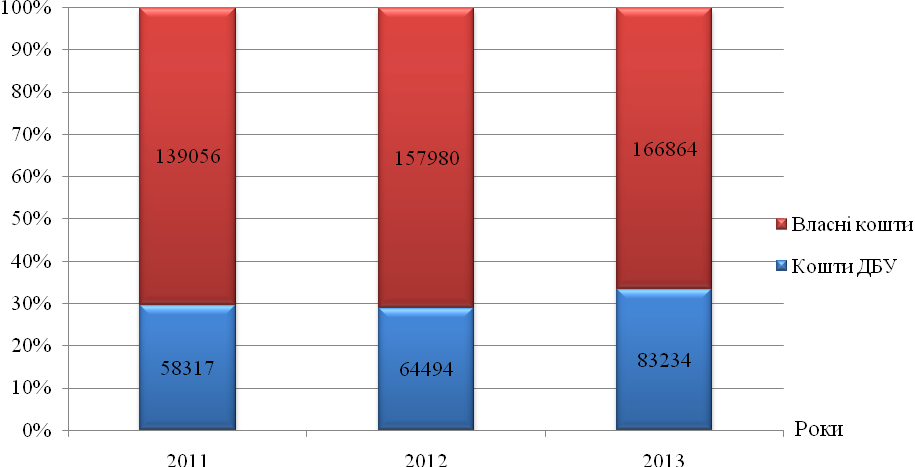 Зазначимо, що до Пенсійного фонду України з усіх законодавчо визначених джерел фінансування за 2013 рік надійшло 250 539, 0 млн. грн., що на 27 907, 8 млн. грн. більше, ніж у 2012 році. З урахуванням залишку коштів, який склався на початок 2012 року, загальний обсяг доходів становив 222 631, 8 млн. грн. При цьому власні надходження у 2011 році дорівнювали 197 553, 6 млн. грн., що на 25 078, 2 млн. грн. менше порівняно із відповідним показником 2012 року і на 52 985, 7 млн. грн. менше ніж у 2013 році. Ці зрушення спричинені підвищенням пенсійного віку населення, що призводить до збільшення власних коштів даного фонду, а також направленість діяльності уряду на покращення соціального становища в країні про що свідчить збільшення коштів Державного бюджету в структурі дохідної частини Пенсійного фонду. Структуру доходної частини бюджету ПФУ та динаміку основних її складових за період 2011–2013 рр. представлено на рис. 2.4.