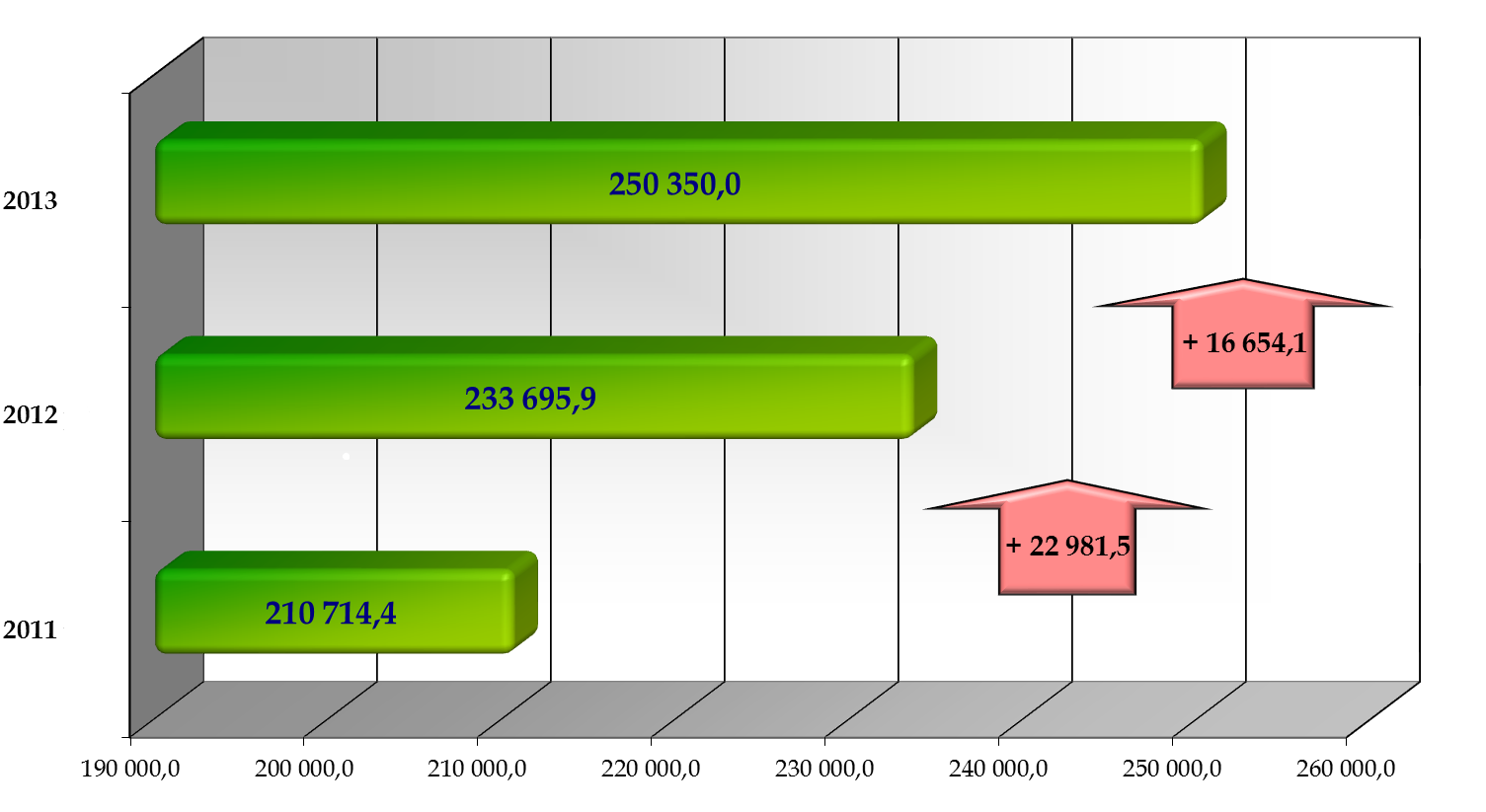 Із Державного бюджету України на фінансування пенсійних програм протягом 2013 року було виділено 83 233, 6 млн. грн., з яких 61 469, 8 млн. грн. – дотації на виплату пенсій, та 21 763, 8 млн. грн. – на покриття дефіциту Пенсійного фонду України для виплати пенсій. У 2012 році було виділено 64 494, 1 млн. грн., з яких 49 170, 2 млн. грн. – дотація на виплату пенсій, надбавок та підвищень до пенсій, призначених за різними пенсійними програмами, 15 323, 9 млн. грн. – кошти на покриття дефіциту Пенсійного фонду України для виплати пенсій. З метою своєчасної та в повному обсязі виплати пенсій і покриття тимчасових касових розривів, пов’язаних із виплатою пенсій Пенсійному фонду України, з єдиного казначейського рахунку відповідно до норм Бюджетного кодексу України впродовж року виділялися позики. Їх повернення відбувалося після закінчення виплатного періоду в межах фінансових можливостей Пенсійного фонду України. Залишок непогашених протягом року сум позик станом на 1 січня 2013 р. становив 11 885, 1 млн. грн. У 2013 році Пенсійний фонд України був забезпечений у повному обсязі фінансовими ресурсами на виплату пенсій та грошової допомоги 13, 6 млн. пенсіонерів. Сума видатків на пенсійні виплати сягала 250 350, 0 млн. грн., що на 39 635, 6 млн. грн. більше порівняно із 2011роком, і на 16 654, 1 млн. грн. менше, ніж у 2012 році. Динаміка видатків ПФУ за період 2011–2013 рр. показана на рис. 2.5.