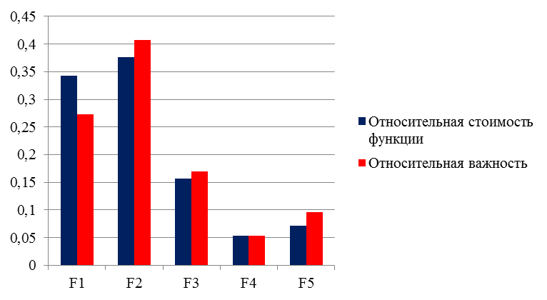 Рисунок 10 – Сопоставление стоимости функции с ее значимостью В результате стоимость завышена для функции F1 (Резка) - это связано с технологической основой секатора – использованием легированной стали, прошедшей специальную термическую обработку, которая обеспечивает повышенную прочность и производительность при резке. Снизить затраты предприятие сможет только при переходе на более дешевый материал, что в данном случае нежелательно, так как, это, вероятно, понизит качество. Завышена стоимость так же и для функции F4 (Возврат в исходное положение), что связано с наличием ленточной возвратной пружины, которая по себестоимости выше, чем у обычной проволочной. Однако здесь разница между относительными стоимостью и важностью небольшая. Для приближения относительной стоимости к значимости функции «Безопасность» (F2) и «Фиксация в закрытом состоянии» (F3) можно добавить к секатору такие дополнительные средства защиты как защитный чехол или колпачок для режущей головки. Недооцененной можно считать функцию F5 (Эстетическая функция, так как потребитель, приобретая секатор, чаще всего обращает внимание не на внешний вид, а на его технические характеристики.
