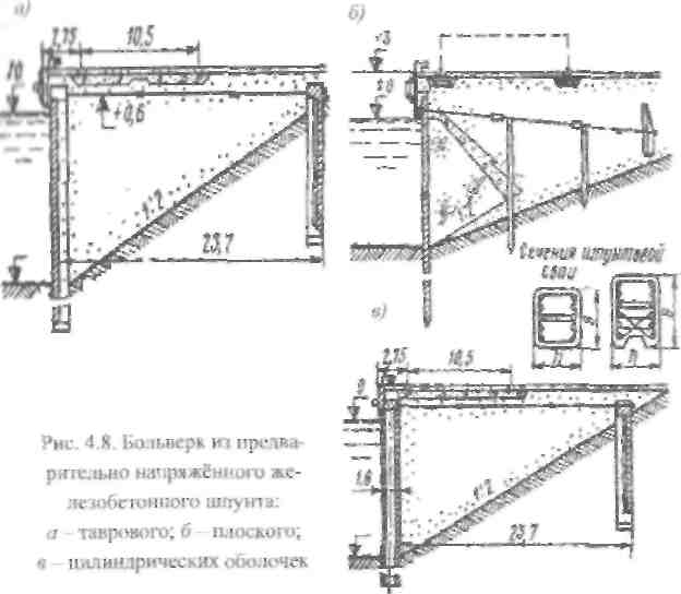 Недостаток металлических больверков - расход сотен тонн длинномерного дорогостоящего проката на один глубоководный причал. Поэтому, как вариант, возможно применение железобетонного шпунта, требующего значительно меньшего расхода металла и обладающего к тому же высокой коррозионной стойкостью. С внедрением предварительно напряжённого железобетона в появилась возможность применения рациональных конструкций: тавровых, цилиндрических оболочек диаметром 1, 2-1, 6.«(рис. 4.8). В конструктивном отношении железобетонные больверки аналогичны металлическим и отличаются лишь отсутствием плотных замков для обеспечения г стенки. В связи с этим устраивается каменная призма с обратным фильтром, а для плотной забивки лицевой стенки имеют пазы и выступы. Первостепенное значение имеет вопрос о долговечности предварительно напряжённых работающих на изгиб.удовлетворения этого требования предусматривается осуществление технологических и специальных мероприятий.