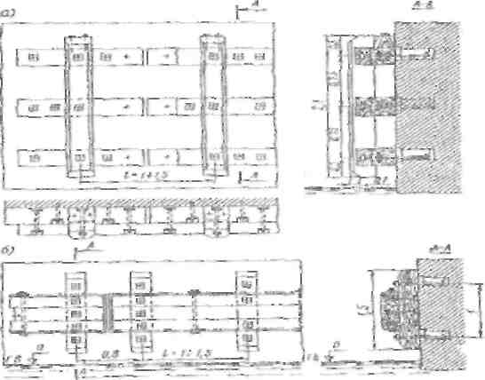 При швартовке и стоянке судов, передаются им сооружениям через отбойные устройства, которые им судно и сооружение от непосредственных механических. По конструктивному признаку используемые отбойные устройств деревянными, резиновыми, полимерными, пневматики, пружинными, гравитационными и гидравлическими. и устройства из дерева до недавнего времени применяли м или связок жердей (фашин), подвешенных на лицевой причала. Наиболее простым видом являются деревянные - форма которых зависит от гидрологических Лицевые брусья отбойной рамы делают вертикальными при любых колебаниях уровня воды (рис. 4.22, а), в остальных случаях - го4.22, 6).