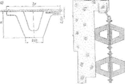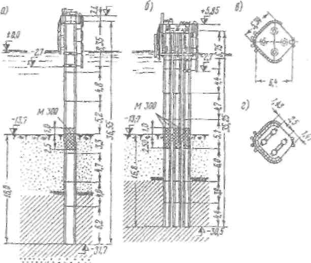 Разработаны гидравлические и пневмогидравлические амортизаторы поршневого типа, основанные на принципе выдавливания жидкости из сосуда (амортизатора) от навала на него борта судна. Однако здесь амортизирующие элементы, имеющие довольно сложную конструкцию с большим числом металлических деталей, оказываются неудобными в эксплуатации. Металлические детали часто повреждаются, коррозируют в агрессивных условиях морской среды, и амортизирующие элементы перестают нормально работать. Палы В связи с ростом судов увеличились горизонтальные усилия, которые передаются на причальные сооружения. Усилия от навала судов на сооружения в отдельных случаях превосходят 400-600 т, усилия в швартовных тросах достигают 250 т. Для восприятия этих усилий на специализированных причалах для крупнотоннажных судов обычно служат специальные опоры - палы. быть самостоятельными элементами, из которых и 'I причалы, или входить в состав причалов, разгружая горизонтальных нагрузок. Соответственно палы им на несколько типов. воспринимающие только швартовные нагрузки, называются (причальными); палы, на которые передаются усилия от ша на причальное сооружение- отбойными. Палы, нагрузки указанных двух групп одновременно - Палы, обеспечивающие правильное направление судна, к причалу или входу в узкую гавань, - направляющими для разворота судна на угол до 90° - разворотными. палы могут быть выполнены из дерева, металла и железобетона делят на гибкие и жёсткие. Гибкие называются весьма податливые в горизонтальном и правлении конструкции, образованные, как правило, из одной Диаметр металлических трубчатых свай в настоящее Время можем достигать 2 м при переменной толщине стенки по длине. применяют сваи, сваренные из сочленённых Гибкими обычно выполняют отбойные или причальные палы, так как их ПО значительно уменьшает усилия от навала судна. Жёсткими называются свайные палы, включающие козловые опоры из наклонных свай, и гравитационные палы, обладающие малой податливостью. Жёсткими обычно устраивают швартовные палы, для которых податливость не имеет существенного значения. Простейшая конструкция гибкого пала из одиночной трубчатой сваи диаметром 1000 мм приведена на рис. 4.29, а. Свая состоит из нескольких секций с толщиной стенок 19 и 25 мм в голове и низу, и 27-55 мм в средней части. Таким образом, учтены изменения величин изгибающих моментов по длине сваи. При необходимости восприятия больших усилий применяют палы, состоящие из нескольких металлических свай. обеспечения совместной работы сваи соединяют между собой диафрагмами (рис. 4.29, б, в, г). Железобетон обычно используют при устройстве жёстких палов, так как податливость железобетонных конструкции невелика. Если нужно обеспечить гашение значительной энергии, то для этой цели используют амортизирующие отбойные устройства. При возведении жестких палов применяют стальные или железобетонные сваи, забиваемые наклонно и объединяемые в головах ростверком в виде платформы или бетонного массива.