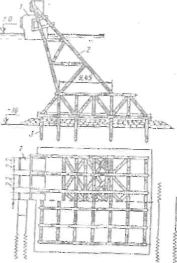 Рис. 4.31. Жёсткий пал из круглого массива-гиганта В одном из портов Японии палы (рис. 4.32) выполнены в виде пространственных металлических ферм 2, которые опираются на отдельные каменные постели, снабжённые основанием в виде низкого свайного ростверка 3 для передачи на грунт горизонтальных на1рузок. С целью восприятия усилия от навала судов палы снабжены гравитационными отбойными устройствами / в виде бетонного блока массой 75 т, подвешенного натягах к верхнему строению палов.