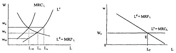 · 3. Стратегия нанимаемого: работник инвестирует время и деньги в повышение собственных производственных возможностей путем получения образования, платит за образование и отказывается от получения дохода, который он мог бы получить в данное время. Цена услуги труда (заработная плата) и количество востребованного труда (занятость) зависят от типа рынка труда. Можно выделить следующие типы рынка труда: 1. Конкурентный рынок труда. Вне зависимости от фирмы, уровень заработной платы одинаков, а доля отдельной фирмы слишком мала, чтобы она могла повлиять на ставку заработной платы. Поэтому для отделения фирмы предложение труда является абсолютноэластичным. При этом предельные затраты фирмы на труд равны ставке заработной платы. Поскольку фирма не определяет заработну плату, то от нее зависит лишь количество нанимаемых работников. Фирма нанимает дополнительных работников до тех пор, пока рост выручки превосходит рост издержек, т.е. пока не будет достигнуто равенство MRPL=MRCL=w. 2. Монопсонический рынок труда. Более реалистическим является рынок несовершенной конкуренции, в частности, монопсонии. Он складывается на локальном рынке труда при наличии единственного работодателя или небольшого количества их. Фирма-монопсонист (градообразующая фирма) может определять уровень заработной платы и численность нанимаемых работников. Кривая предложения поднимается плавно, так как фирма должна платить более высокую зарплату для привлечения большего числа работников. При этом она вынуждена доплачивать ранее нанятым рабочим разницу между их ставкой и ставкой следующего рабочего. Например, если ставка первого работающего равна 6, а следующего - 7, то двум рабочим она заплатит 14 и предельные издержки на труд будут равны 14-6 = 8. Поэтому кривая предельных издержек на труд (MRCL) не совпадает с кривой предложения труда (SL). Чтобы максимизировать прибыль, наниматель уравновешивает MRCL с MRPL. При этом он будет нанимать меньше рабочих (Qm) и платить им меньшую зарплату (W), чем на конкурентном рынке.