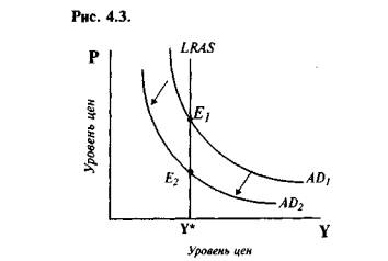Сдвиги AS возможны лишь при изменении величины факторов производства или технологии. Если такие изменения отсутствуют, то кривая AS в долгосрочном периоде (LRAS - от английского long run aggregate supply curve) фиксирована на уровне потенциального выпуска, и любые колебания совокупного спроса отражаются лишь на уровне цен (см. рис. 4.3.).