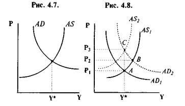 Пересечение кривых AD и AS определяет равновесный объем выпуска и уровень цен в экономике. При нарушении равновесия в экономике, близкой к полной занятости, например, в результате изменения совокупного спроса, вслед за непосредственной реакцией и установлением краткосрочного равновесия продолжается движение к состоянию устойчивого равновесия. Этот переход осуществляется через корректировку цен (рис. 4.5.).