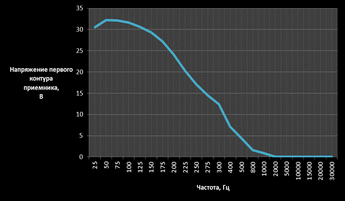 Рисунок 24 – Зависимость напряжения приемника от частоты электромагнитного сигнала.
