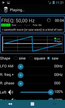 Во время проведения экспериментов в качестве генератора использовалась программа Frequency Sound Generator, распространяемая бесплатно на платформе Android OC. На рисунке 27 представлены параметры и внешний вид генератора. Данная программа позволяет использовать такие виды сигнала, как синусоидальный, квадратный (импульсный) и треугольный. Кроме того, наличие встроенных регуляторов изменения уровня электронного шума, импеданса и гармоник позволяет создать практически любую форму сигнала. Возможна регуляция сигнала от 0 до 20 000 Гц.