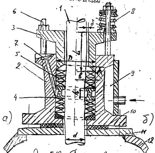 1. – вал; 2. – корпус; 3. – нажимная втулка; 4. – фонарь; 5. – набивка; 6. – нажимные болты; 7. – канал для смазки или охлаждения; 8. – пружина; 9. – камера охлаждения; 10. – прокладка; 11. – опорный фланец; 12. – корпус аппарата.