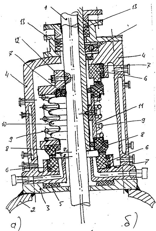 1. – вал; 2. – корпус аппарата; 3. – опорный фланец; 4. – корпус уплотнения; 5. – прокладка; 6. – неподвижная втулка; 7. – эластичные уплотнительные кольца; 8. – подвижная втулка; 9. – пружина (прижимает 6 к 8); 10. – сильфон; 11. – зубчатая втулка; 12. – вращающаяся втулка (ведущая); 13. – сальниковое уплотнение; 14. – встроенный опорный подшипник.