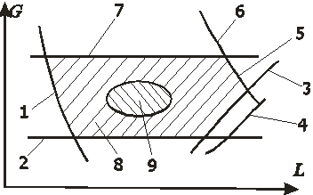 1 – малая нагрузка тарелки по жидкости (для колпачковой тарелки это значит, что колпачки погружены в жидкости или малая высота сливной планки). 2 – малая нагрузка по пару, пульсация по пару, только отдельные пузырьки прорываются через слой жидкости. 3 – неравномерное парораспределение по колпачкам, тарелка работает не равномерно (бывает наиболее часто). 4 – плохое парораспределение для тарелки. Жидкость попадает в паровые патрубки или нарушено направленное движение потоков пара и жидкости. 5 – режим захлебывания или унос жидкости с тарелки на тарелку. 6 – полное захлебывание и интенсивный унос жидкости. 7 – перегрузка по пару (пар сдувает всю жидкость). 8 – область нормальной работы. 9 – область оптимальной работы.