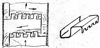 Тарелки этого типа изготавливают в соответствии с ОСТ 26-536-78 с диаметром 1000-8000 м. Расстояние между тарелками ³ 450 мм. Однопоточные НТ = 450¸ 900 мм и двухпоточные НТ = 600¸ 900 мм. Полотно тарелки набирается из S-образных элементов, при сборке которых образуются каналы для пар. Чтобы закрыть каналы с торцов и увеличить жесткость тарелки, между S- образными элементами устанавливают пластины. В этих тарелках пар выходит из контактных элементов в направлении движения жидкости. Это способствует уменьшению градиента уровня жидкости (D) на тарелке. Тарелки большого диаметра могут быть двух и четырех поточными. КПД тарелки h =0.6¸ 0.8 hMAX при скорости пара w = 0.7¸ 0.9 м/с. Скорость пара определяется по формуле (8.4.) Саудерса-Брауна: