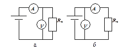 ЭДС источников равны, когда показание гальванометра равно нулю. Основное достоинство такого способа измерения состоит в том, что в этом случае не происходит отбора тока от источника. Этот способ удобен для измерения ЭДС источников с большим внутренним сопротивлением. Особенно хорошо видны преимущества методов сравнения при измерении сопротивлений. Можно определить сопротивление, воспользовавшись амперметром и вольтметром (R = U / I). Такой способ (способ амперметра и вольтметра) является наиболее простым, но наименее точным из-за присущей ему систематической ошибки. Два варианта включения измерительных приборов показаны на рис. 4. На рис. 4, а приведена схема «правильная по напряжению», но амперметр показывает сумму токов, текущих через вольтметр и нагрузку. На рис. 4, б – схема «правильная по току», но вольтметр показывает сумму падений напряжения на амперметре и нагрузке.