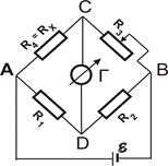 Широкое применение для измерения сопротивлений получили мосты, питаемые постоянным током, так как их уравновешивание несложно и подбор подходящего гальванометра не составляет особого труда. Примером такой схемы сравнения может служить четырёхплечевой мост постоянного тока, применяемый для измерения сопротивлений (рис. 5).