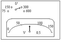 На рис. 6 изображён многопредельный вольтметр. Вычислим абсолютную и относительную погрешности определения напряжения. Класс точности вольтметра 0, 5. Номинальное значение напряжения 300 В (определяется положением переключателя пределов напряжения). Цена деления данного предела измерения ЦД = Измеренное значение напряжения U ИЗМ = 2 В/дел.·75 дел. = 150 В. Абсолютная погрешность измерения D U = Относительная погрешность измерения g0 =