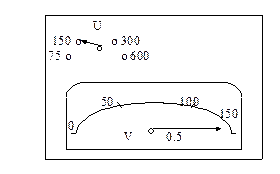 На рис. 7 изображен тот же многопредельный вольтметр при другом положении переключателя пределов измерений. Вычислим абсолютную и относительную погрешности определения напряжения. Номинальное значение напряжения 150 В. Цена деления данного предела измерения ЦД = 150 В / 150 дел. = 1 В/дел. Измеренное значение напряжения U ИЗМ = 1 В/дел.× 150 дел. = 150 В. Абсолютная погрешность измерения D U = Относительная погрешность измерения g0 = Таким образом, выбор наиболее подходящего предела измерения приводит к уменьшению как абсолютной, так и относительной погрешности.