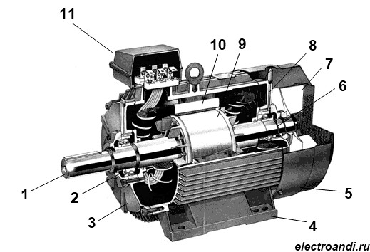 На рисунке: 1 - вал, 2, 6 - подшипники, 3, 8 - подшипниковые щиты, 4 - лапы, 5 - кожух вентилятора, 7 - крыльчатка вентилятора, 9 - короткозамкнутый ротор, 10 - статор, 11 - коробка выводов. Основными частями асинхронного двигателя являются статор (10) и ротор (9). Статор имеет цилиндрическую форму, и собирается из листов стали. В пазах сердечника статора уложены обмотки статора, которые выполнены из обмоточного провода. Оси обмоток сдвинуты в пространстве относительно друг друга на угол 120°. В зависимости от подаваемого напряжения концы обмоток соединяются треугольником или звездой.