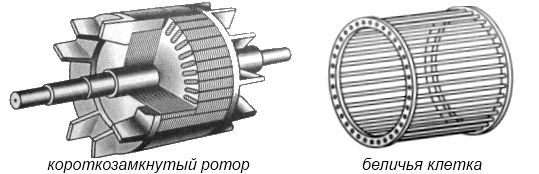 Роторы асинхронного двигателя бывают двух видов: короткозамкнутый и фазный ротор. Короткозамкнутый ротор представляет собой сердечник, набранный из листов стали. В пазы этого сердечника заливается расплавленный алюминий, в результате чего образуются стержни, которые замыкаются накоротко торцевыми кольцами. Эта конструкция называется " беличьей клеткой". В двигателях большой мощности вместо алюминия может применяться медь. Беличья клетка представляет собой короткозамкнутую обмотку ротора, откуда собственно название.