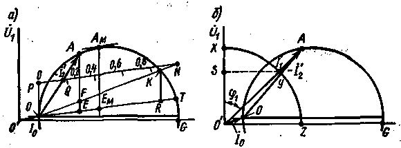 Частота вращения ротора. При переходе от режима холостото хода к режиму полной нагрузки частота вращения n2 изменяется незначительно, так как при проектировании двигателей для уменьшения потерь мощности в роторе Δ Р эл2 необходимо, чтобы скольжение при номинальном режиме не превышало 0, 02—0, 06. Следовательно, скоростная характеристика асинхронного двигателя является «жесткой». Характеристики n2 = f(P2) и n2 = f(М) можно построить по круговой диаграмме. Для этого задаются рядом точек на окружности токов и находят соответствующие им значения полезной мощности, электромагнитного момента и скольжения. При расчетах, не требующих большой точности, полезную мощность Р 2 принимают равной Р мех (пренебрегая потерями мощности Δ Р т ), т. е. считают, что она пропорциональна отрезку AM круговой диаграммы (см. рис. 4.17). Более точно ее определяют путем построения на круговой диаграмме специальной линии полезной мощности О" К (см. рис. 4.18, 6), которую получают, соединяя точку О " реального холостого хода с точкой К (в режимах, соответствующих точкам О и К, мощность Р 2 = 0). В этом случае величина Р 2 пропорциональна отрезку AM, заключенному между окружностью токов и линией 0" К. Электромагнитный момент пропорционален отрезку AE круговой диаграммы (см. рис. 4.17). Чтобы определить максимальный момент (рис. 4.26, а), через точку А м проводят касательную к окружности токов параллельно линии ОТ и из этой точки опускают перпендикуляр на диаметр окружности токов. Максимальный момент пропорционален отрезку A м E м, где Е м - точка пересечения перпендикуляра с прямой ОТ.
