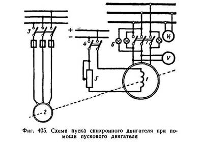 На фиг. 405 показана схема пуска оинхрониого двигателя 1 с помощью вспомогательного асинхронного двигателя 2. Для осуществления пуска необходимо, чтобы число пар полюсов асинхронного двигателя было меньше числа пар полюсов синхронного двигателя, ибо при этих условиях вспомогательный асинхронный двигатель может развернуть ротор синхронного двигателя до синхронной скорости. Порядок пуска синхронного двигателя следующий. Включая рубильник 3, пускают вспомогательный асинхронный двигатель 2, который разворачивает ротор синхронного двигателя 1 до скорости, соответствующей скорости поля статора. Скорость вращения вспомогательного двигателя определяется по тахометру1. Затем, включая рубильник 4 постоянного тока, возбуждают полюсы ротора. Чтобы включить синхронный двигатель в сеть трехфазного тока, его нужно синхронизировать так же, как и при включении синхронного генератора на параллельную работу. Для этого реостатом 5 устанавливают такое возбуждение, чтобы напряжение обмотки статора по вольтметру V было равно напряжению сети, указываемому вольтметром V1.