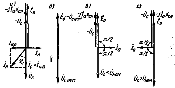 Если напряжение сети в точке подключения синхронного компенсатора несколько понижается из-за возрастания тока нагрузки I н и становится меньше U с.ном, то синхронный компенсатор начинает забирать из сети реактивный опережающий ток Í а (рис. 6.55, в). Это уменьшает падение напряжения в ней на величину Δ U к = I a X c. При повышении напряжения в сети, когда U c > U с.ном, синхронный компенсатор загружает сеть реактивным отстающим током Í а (рис. 6.55, г), что приводит к увеличению падения напряжения на величину Δ U к = I a X c. При достаточной мощности синхронного компенсатора колебания напряжения в сети не превышают 0, 5 —1, 0 %. Недостатком указанного метода стабилизации напряжения является то, что синхронный компенсатор загружает линию реактивным током, увеличивая потери в ней.