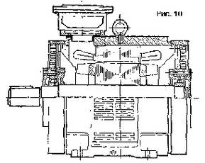 Защищенный электродвигатель (степень защиты IP23) IP44 – электродвигатель, защищенный от попадания твердых тел размером более 1 мм и от водных брызг (закрытая машина); IP54 – электродвигатель полностью защищен от соприкосновения персонала к токоведущим и вращающимся частям; пыль, попадая внутрь машины не нарушает ее нормальную работы; двигатель защищен от водяных брызг (закрытая машина). На рис. 9 приведены принципиальная конструкция асинхронного двигателя закрытого исполнения (степень защиты IP44). На рис. 10 дана принципиальная конструкция асинхронного двигателя защищенного исполнения (степень защиты IP23). При выборе асинхронных двигателей для определенного вида привода обязательно следует учитывать степень защиты его от внешних воздействий.