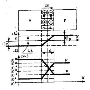 В результате того, что носители заряда в каждом ПП совершают беспорядочно тепловое движение, то происходит их диффузия из одного ПП в другой. Как и при любой другой диффузии, например, в газах или жидкостях, носители перемещаются оттуда, где их концентрация больше, туда, где их концентрация меньше. Т.о. из n-типа в ПП р-типа диффундируют электроны, а в обратном направлении из ПП р-типа в n-типа диффундируют дырки. В результате диффузии носителей по обе стороны границы раздела двух ПП с различным типом электропроводности создаются объемные заряды различных знаков. В области n возникает объемный положительный заряд. Он образован главным образом положительно заряженными атомами донорной примеси и в небольшой степени – пришедшими в эту область дырками. Подобно этому в области р возникает отрицательный объемный заряд, образованный отрицательно заряженными атомами акцепторной примеси и, отчасти, пришедшими сюда электронами. Между образовавшимися объемными зарядами возникает так называемая контактная разность потенциалов Uk = Un – Up, а следовательно, и электрическое поле с напряженностью Ек, т.е. в р-n-переходе возникает потенциальный барьер, препятствующий диффузионному переходу носителей. Высота барьера равна контактной разности потенциалов и обычно составляет десятые доли вольта. Причем, чем больше концентрация примесей, тем выше концентрация основных носителей и тем больше их число диффундирует через границу. Плотность объемных зарядов возрастает и увеличивается контактная разность потенциалов Uк, т.е. высота потенциального барьера. При этом толщина р-n-перехода d (рис.1) уменьшается, так как соответствующие объемные заряды образуются в приграничных слоях меньшей толщины.