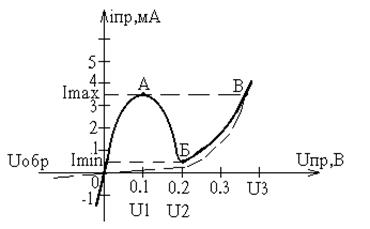 Принцип действия тоже основан на туннельном эффекте, причем высота потенциального барьера при отсутствии внешнего напряжения равна ширине запрещенной зоны, в результате чего при прямом напряжении обращенный диод работает как обычный выпрямительный диод, а при обратном - как туннельный. Поэтому обращенный диод при обратном включении обладает лучшей проводимостью, чем при прямом. Обращенные диоды могут работать в качестве детекторов на более высоких частотах, чем обычные диоды.