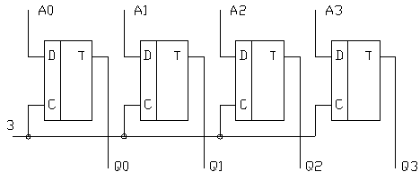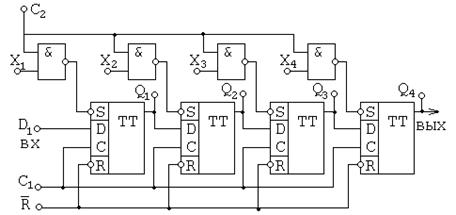 Рис. 6 – Последовательный регистр Изображенный регистр называют ещё последовательным регистром, т.к. информация в него вводится посредством входа Т последовательно, в течение 4х тактовых импульсов.