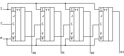Данный двоичный счётчик кроме тактового входа C имеет входы асинхронного сброса и установки R и S. Асинхронными они называются потому, что не зависят от тактового входа. Из таблицы соответственно видно две особенности: 1) переключение более старшего разряда в 1 происходит после переключения более младшего разряда из 1 в 0. На этой особенности построен принцип действия асинхронного счётчика. 2) переключение более старшего разряда из 0 в 1 происходит после того, когда все младшие разряды будут находится в состояние 1. На второй особенности основан принцип действия синхронного сдвига.
