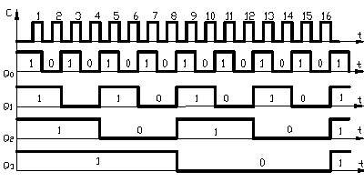 Счетчик представляет собой устройство, предназначенное для подсчета числа сигналов, поступающих на его вход, и фиксации этого числа в виде кода, хранящегося в триггерах. По целевому назначению счетчики подразделяют на простые (суммирующие и вычитающие) и реверсивные. Суммирующий счетчик предназначен для работы в прямом направлении, то есть для сложения. С поддачей на вход очередного единичного сигнала показание счетчика увеличивается на единицу. Каждый сигнал, поступающий на вход вычитающего счетчика, уменьшает его показания на единицу. Реверсивные счетчики могут работать в обоих режимах. По способу организации счета счетчики подразделяют на асинхронные и синхронные. По способу организации цепей переноса между разрядами различают счетчики с последовательным, параллельным и частично-параллельным переносом. Основными характеристиками счетчика являются модуль счета, разрешающая способность, время регистрации и емкость. Модуль счета характеризует число устойчивых состояний счетчика, то есть предельное число входных сигналов, которое может сосчитать счетчик. Разрешающая способность - минимально допустимый период следования входных сигналов, при котором обеспечивается надежная работа счетчика. Время регистрации - интервал времени между моментами насыщения входного сигнала и окончания самого длинного переходного процесса в счетчике. Емкость счетчика - максимальное число единичных сигналов, которое может быть зарегистрировано в счетчике. Счетчики с непосредственными связями с последовательным переносом (асинхронные) В этих счетчиках каждый последующий триггер (i+1)-го разряда запускается от информационных выходов предыдущего триггера i-го разряда, а счетный сигнал поступает на вход триггера первого разряда. Четырехразрядный асинхронный двоичный счётчик по модулю 16 Счётчики представляют собой цифровое устройство, которое ставит в соответствие числу импульсов на входе определённый двоичный код на выходе
