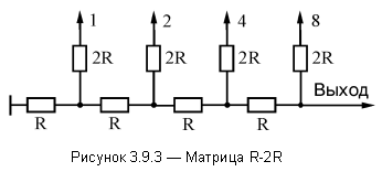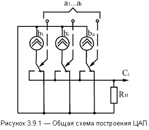dа = Численно абсолютная разрешающая способность равна шагу квантования Duкв. 3. Абсолютная погрешность преобразования dпш 4. Нелинейность преобразования ЦАП dлн определяет максимальное отклонение реальной характеристики от идеальной и оценивается также в процентах или в единицах младшего значащего разряда. 5. Дифференциальная нелинейность преобразования ЦАП dдф.лн численно равна максимальной разности двух соседних приращений (шагов квантования) dдф.лн = Duкв 1 - Duкв2. Дифференциальная нелинейность оценивается в младших значащих разрядах и обычно не превышает нескольких единиц мр. Время установления выходного напряжения или тока tуст - интервал времени от подачи входного двоичного входного кода до вхождения выходного сигнала в заданные пределы. Максимальная частота преобразования fпр - наибольшая частота дискретизации, при которой параметры ЦАП соответствуют заданным значениям. Максимальная частота и время установления определяют быстродействие ЦАП. Виды ЦАП условно можно разделить на две группы: с резисторными матрицами, безматричные ЦАП. В интегральном исполнении применяются только ЦАП с прецизионными резисторными матрицами, формирующими выходные сигналы путем суммирования токов. ЦАП содержит элементы цифровой и аналоговой схемотехники. В качестве аналоговых элементов используются операционные усилители, аналоговые ключи (коммутаторы), резисторные матрицы и т.д. Цифро-аналоговые преобразователи (далее — ЦАП) предназначены для преобразования цифровых сигналов в аналоговые и служат для сопряжения цифровых устройств формирования и обработки сигналов с аналоговыми потребителями информации. Они широко используются для управления аналоговыми устройствами при помощи ЭВМ. Принцип работы заключается в следующем. Для формирования аналогового сигнала на выходе, однозначно соответствующего цифровому коду входного сигнала, аналоговые ключи аi подключают к выходу ЦАП необходимое количество источников опорных сигналов bi, величина которых пропорциональна весу соответствующего двоичного разряда (рисунок 3.9.1). Наибольшее распространение в настоящее время получили микроэлектронные ЦАП. Их в общем случае можно разделить на преобразователи с прямым и промежуточным преобразованием. Преобразователи с прямым преобразованием обычно параллельного типа. В состав простейшей схемы ЦАП обычно входят источники опорного напряжения, резистивные или активные делители, аналоговые ключи. В качестве делителей чаще всего применяются матрицы R – 2R. Суммирование токов, образованных подключением соответствующих источников, производится операционным усилителем (далее — ОУ). Учитывая, что входное сопротивление и коэффициент усиления ОУ очень велики, можно заключить, что ток в его входной цепи практически не протекает, а все составляющие токов, протекающих через открытые ключи схемы, замыкаются на землю через резистор RОС, уравновешиваясь током IОС, текущим в цепи ОС. ОУ выполняет операцию суммирования токов, которые определяются значениями сопротивлений в тех разрядах ЦАП, где аi=1