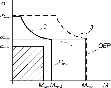 Рисунок 4 – Предельные механические характеристики при различных системах управления: 1 – Схема подчиненного регулирования с управлением по якорю; 2 – Система «источник тока – двигатель»; 3 – Система двузонного регулирования