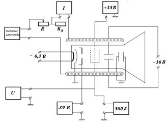 Напряжение на электроды трубки подается от источников высокого напряжения типа У-1136 и блока питания Б3-2. Напряжение накала катода ~ 6, 3 В. Отрицательное напряжение, подаваемое на модулятор, составляет величину -39 В. На первый анод электронно-лучевой трубки подается напряжение +35 В. Напряжение, подаваемое на второй анод, регулируется в диапазоне от 500 до 800 вольт и измеряется с помощью электронного вольтметра ВК 7-10А/1. На вертикально отклоняющие пластины подается переменное напряжение порядка 36 В от понижающего трансформатора. Горизонтальные пластины заземлены и соединены с катодом. Электронно-лучевая трубка располагается по оси соленоида, внутри которого постоянным током, проходящим по катушке соленоида, создается осевое магнитное поле. Катушка соленоида питается от стабилизированного источника напряжения ВС-25, при этом величина протекающего по катушке тока регулируется реостатом